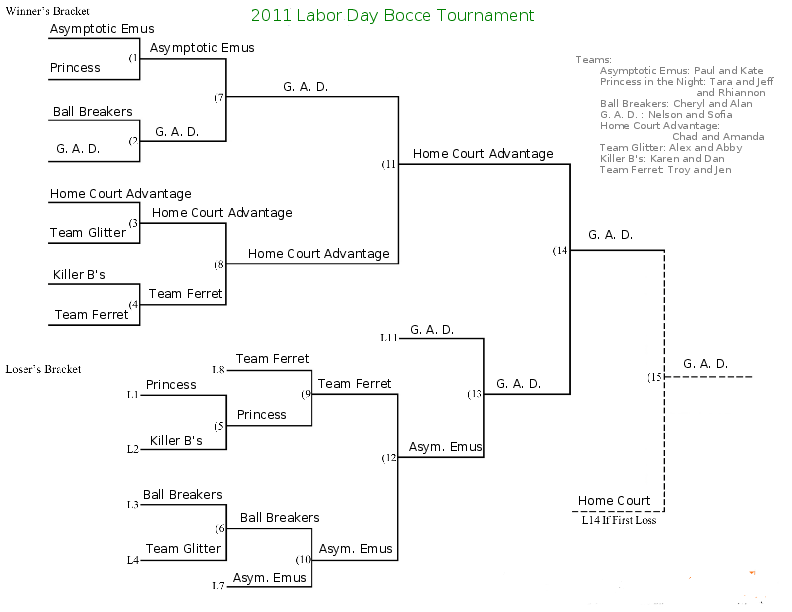Starting in 2011, Chad and Amanda decide to host an annual Labor Day bocce tournament. This would be near the anniversary of the house they'd bought in 2010, and that they'd worked very hard on (especially the back yard). Inviting family and friends, the event is structured as a double elimination tournament. See below for rules.
