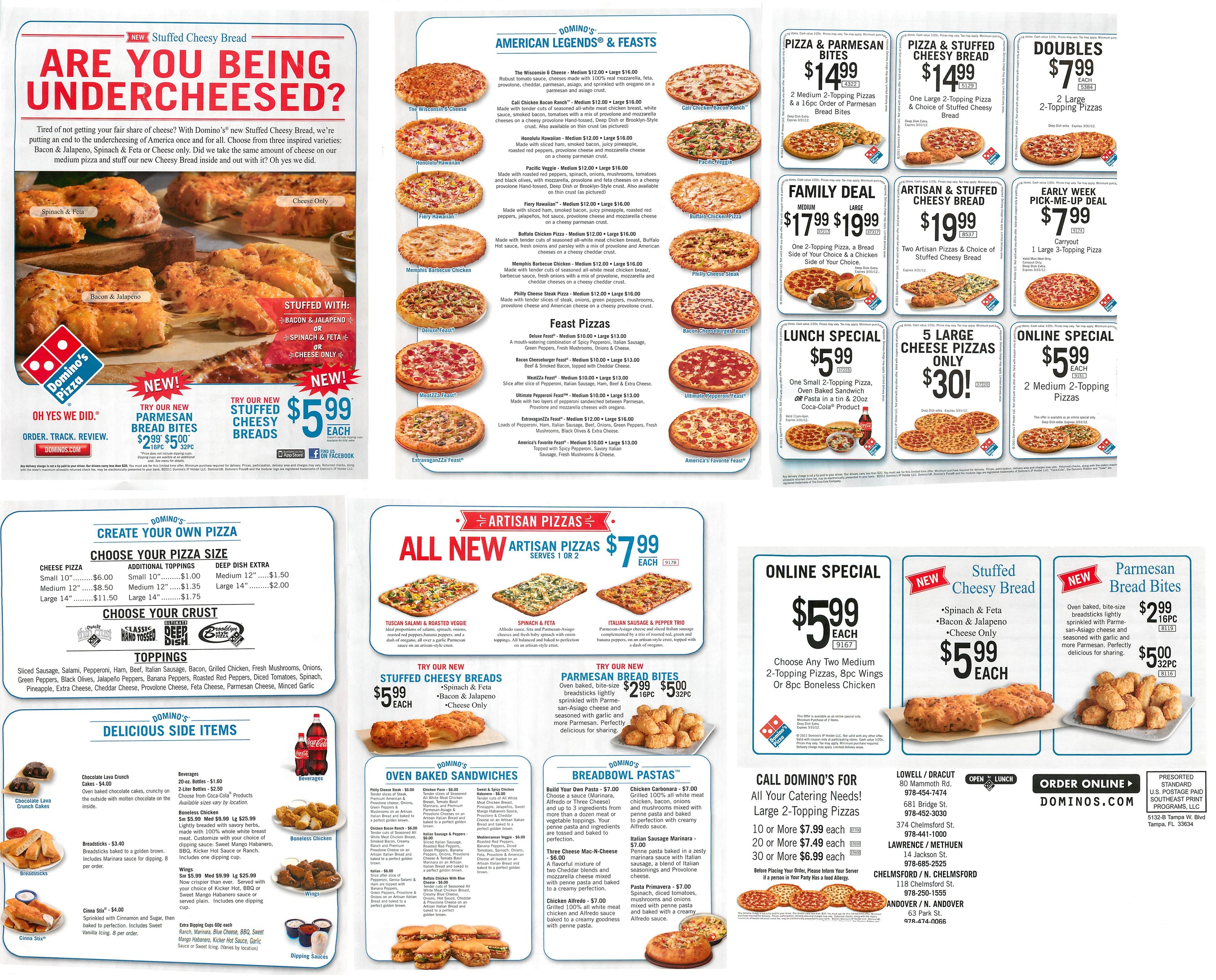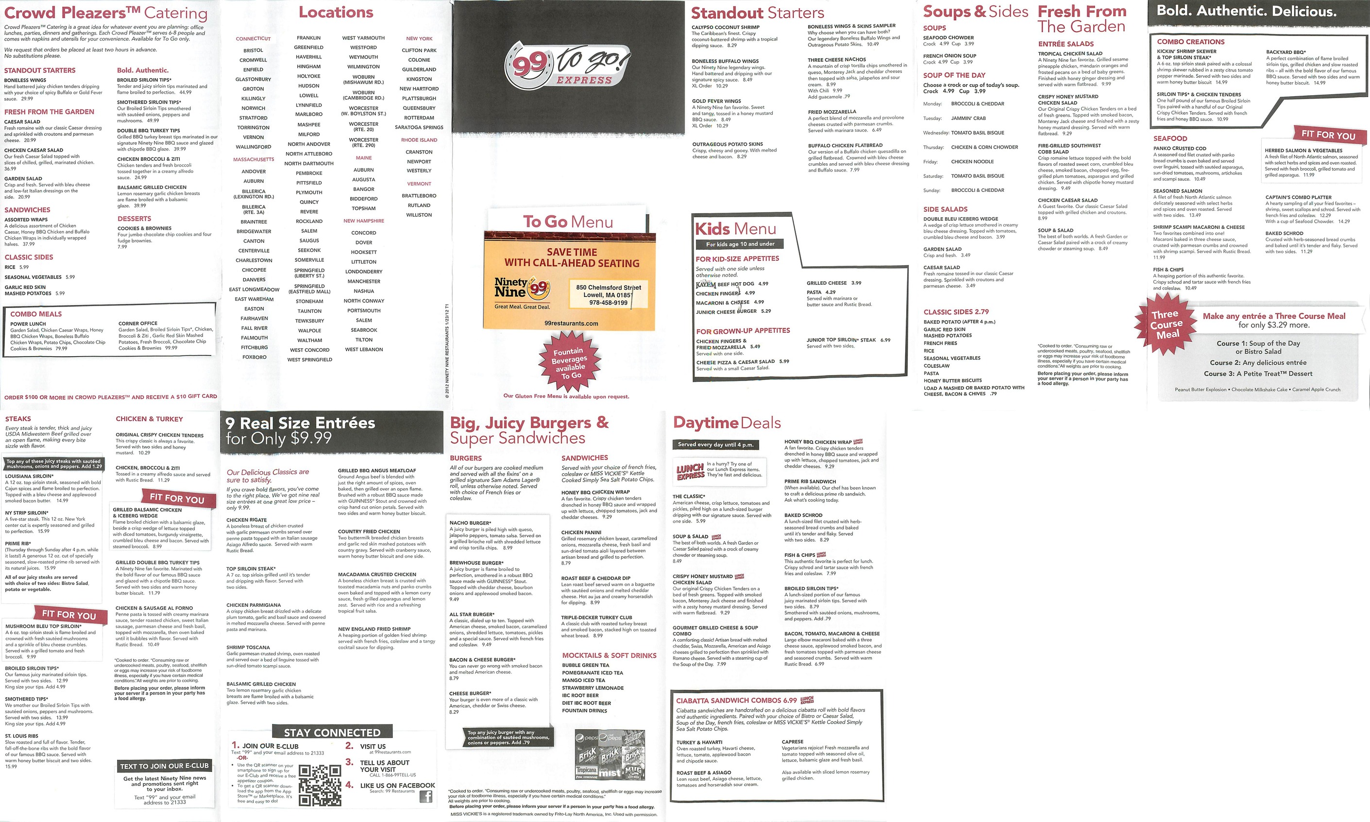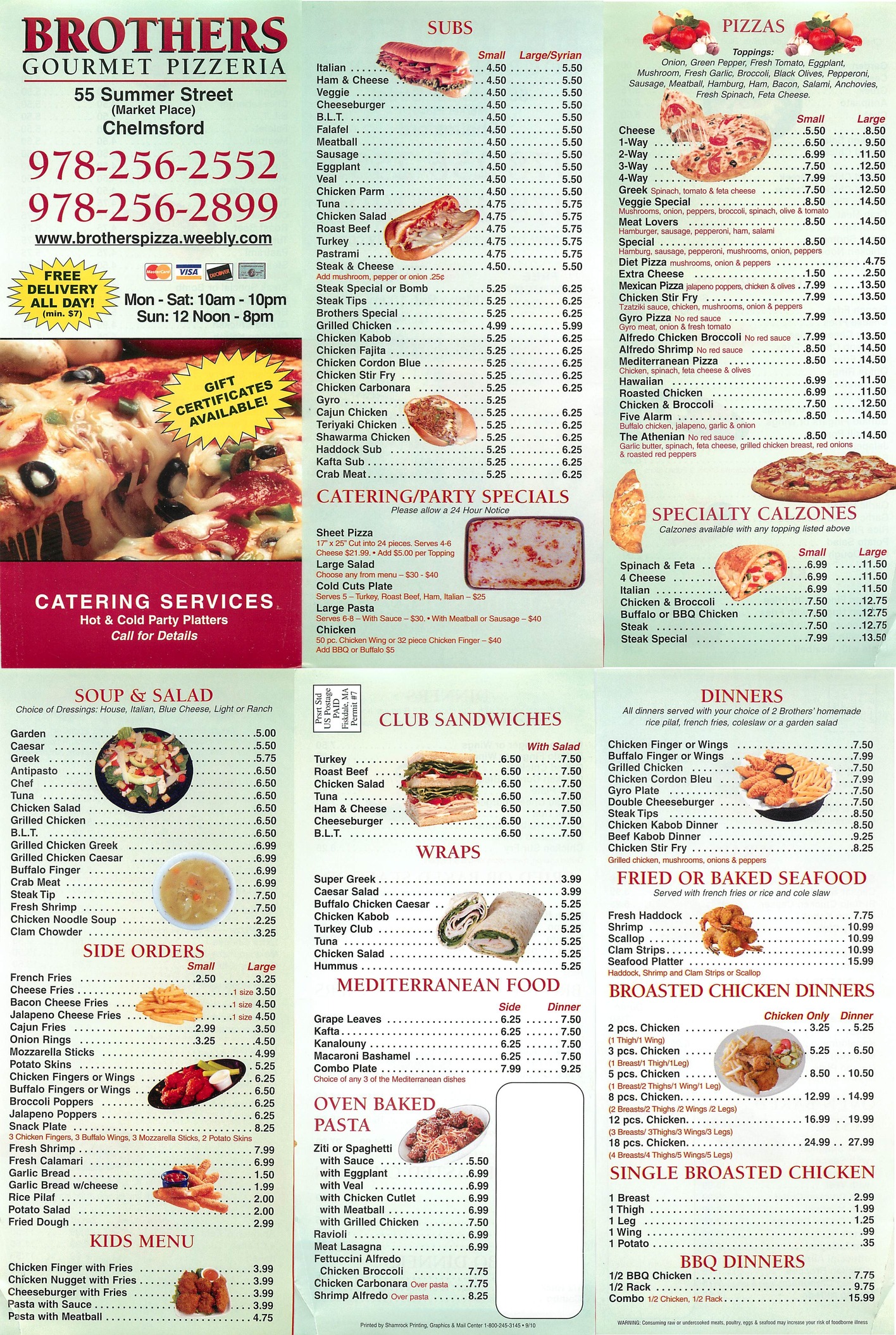 | The 99 American 850 Chelmsford Street Lowell 01851 978-458-9199 | | Brother's Pizza Pizza and Sandwiches 55 Summer Street Chelmsford 01824 978-256-2552 | |