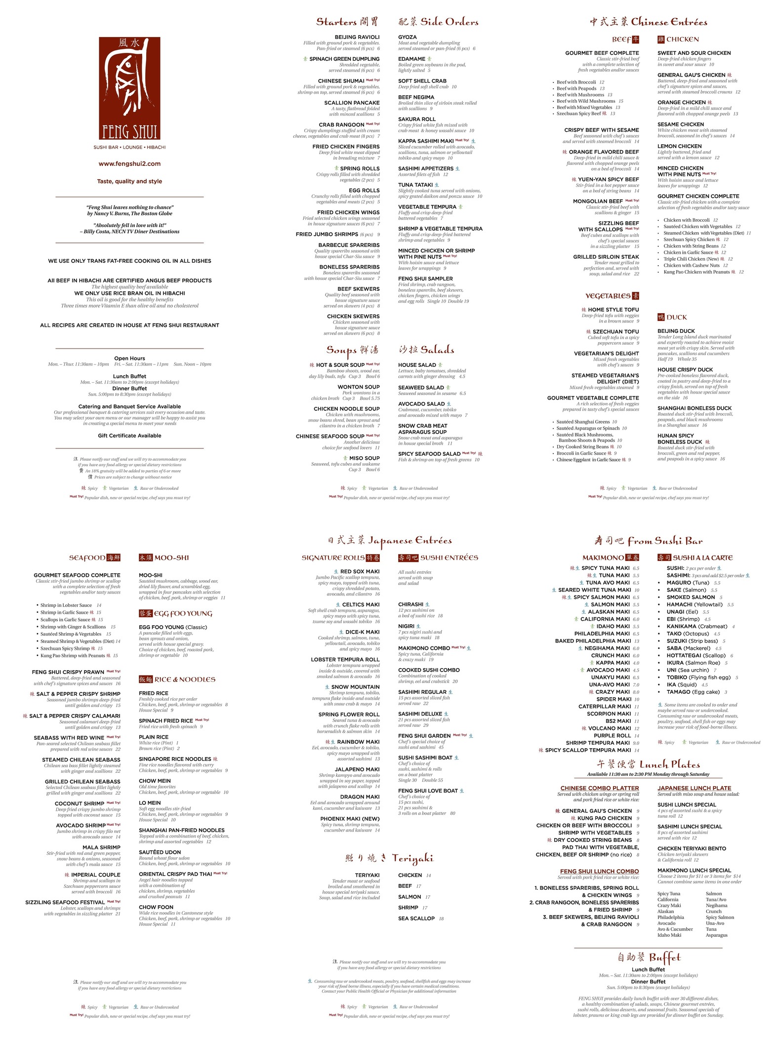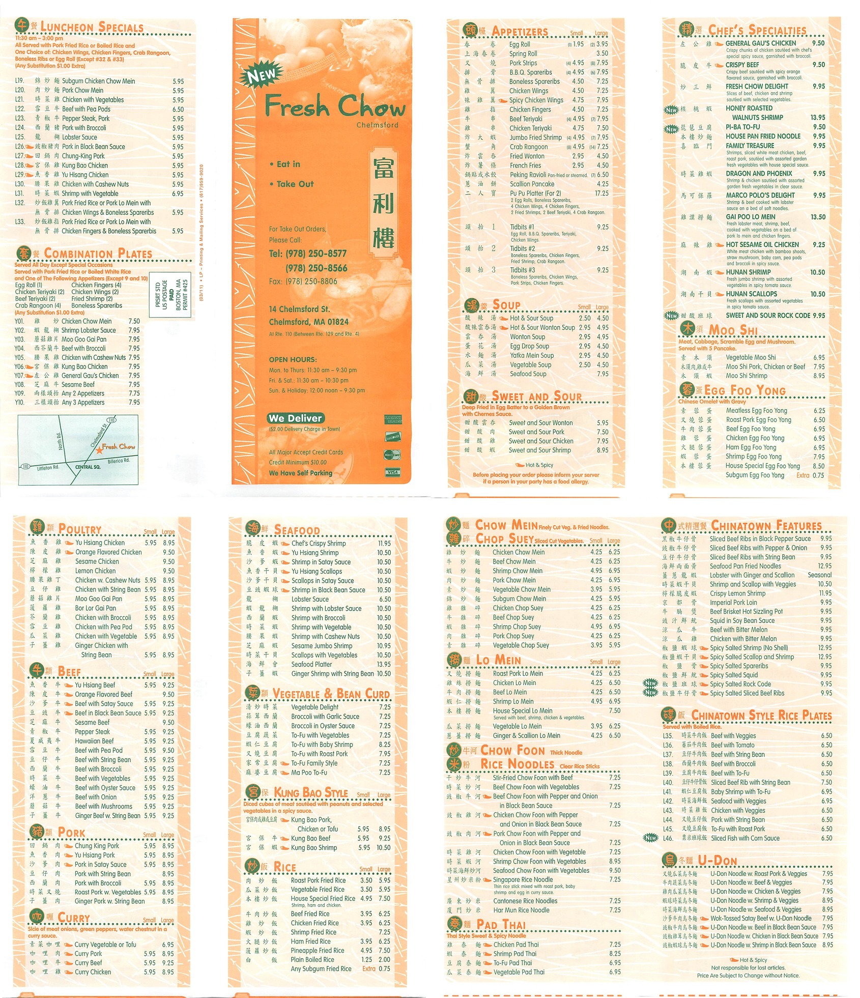 | Feng Shui Japanese/Chinese/Sushi/Hibachi 285 Chelmsford Street Chelmsford 978.250.8888 | | Fresh Chow Chinese/Thai 14 Chelmsford Street Chelmsford 01824 978-250-8577 | |