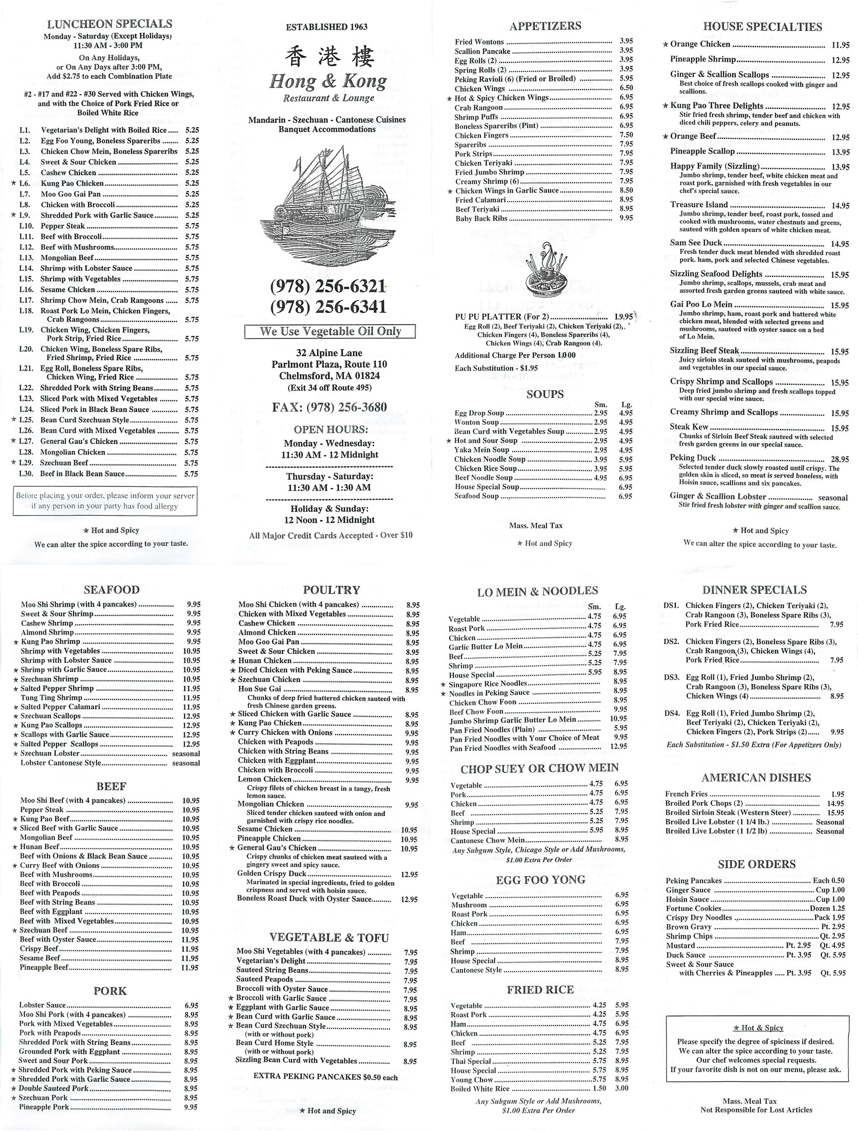 | Friendly's American 20 Boston Road Chelmsford 01824 978-256-5351 | | Hong and Kong Chinese 32 Alpine Lane Chelmsford 01824 (978) 256-6321 | |