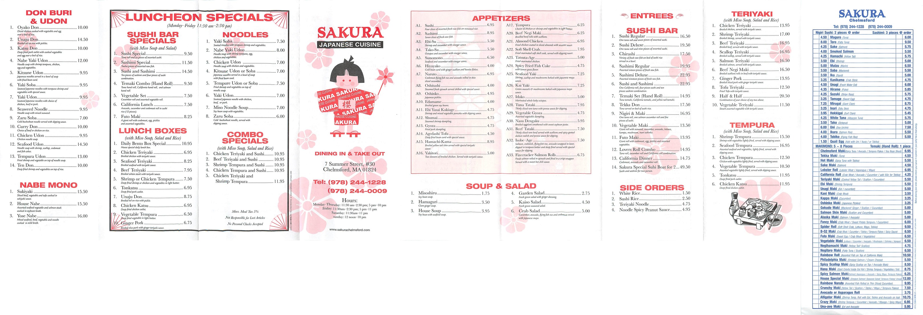 | Papa Gino's Pizza 29 Chelmsford Street Chelmsford 01824 978-256-6999 | | Sakura Japanese 7 Summer Street Chelmsford 01824 978-244-1228 | |