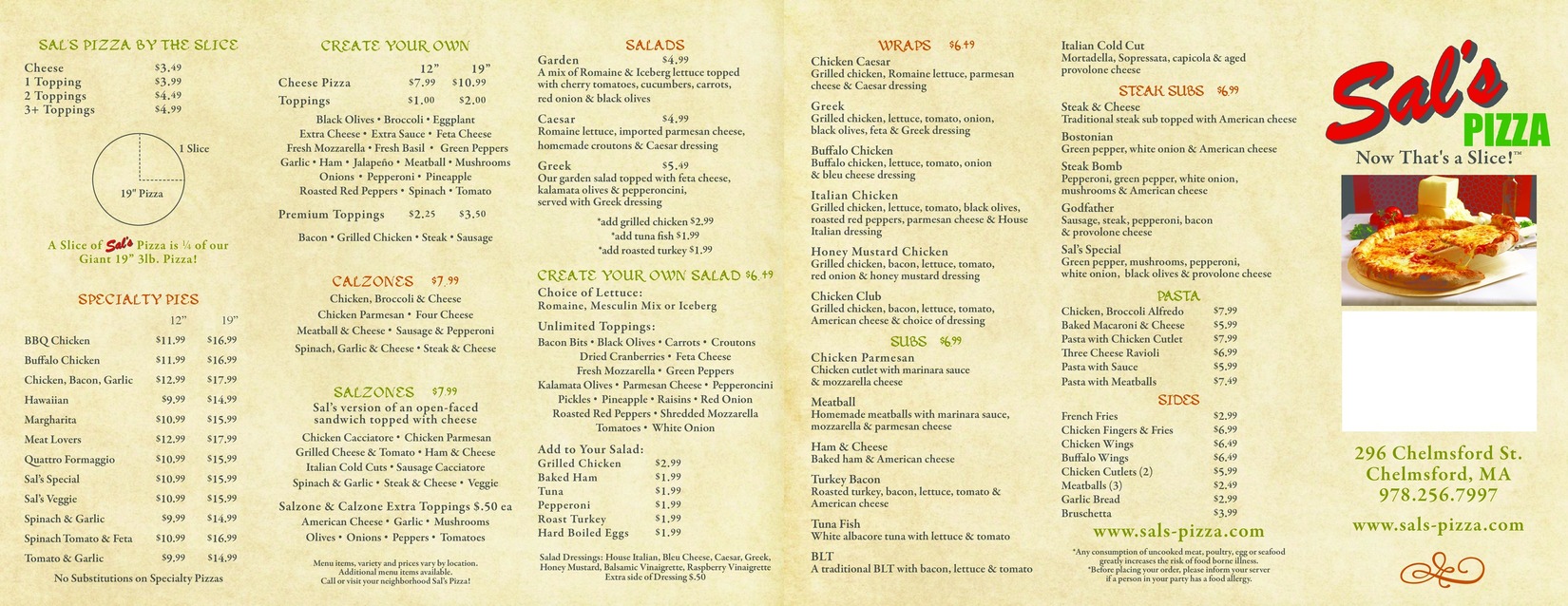 | The 99 American 850 Chelmsford Street Lowell 01851 978-458-9199 | | Brother's Pizza Pizza and Sandwiches 55 Summer Street Chelmsford 01824 978-256-2552 | |