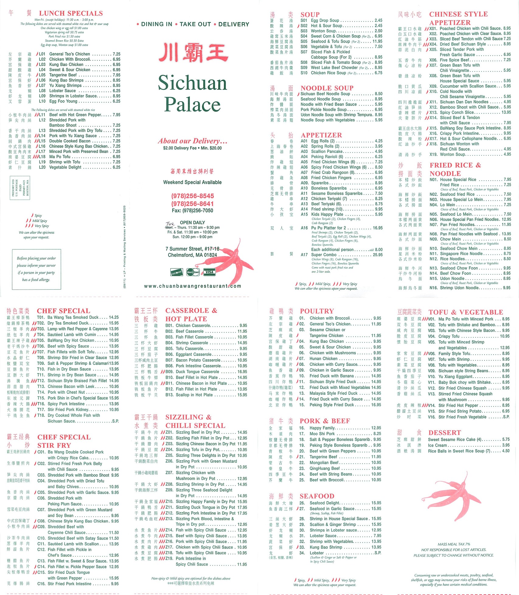 | Sal's Pizza Pizza 296 Chelmsford Street Chelmsford 01824 978-256-7997 | | Sichuan Palace Chinese/Taiwanese 7 Summer Street Chelmsford 01824 (978)256-8545 | |